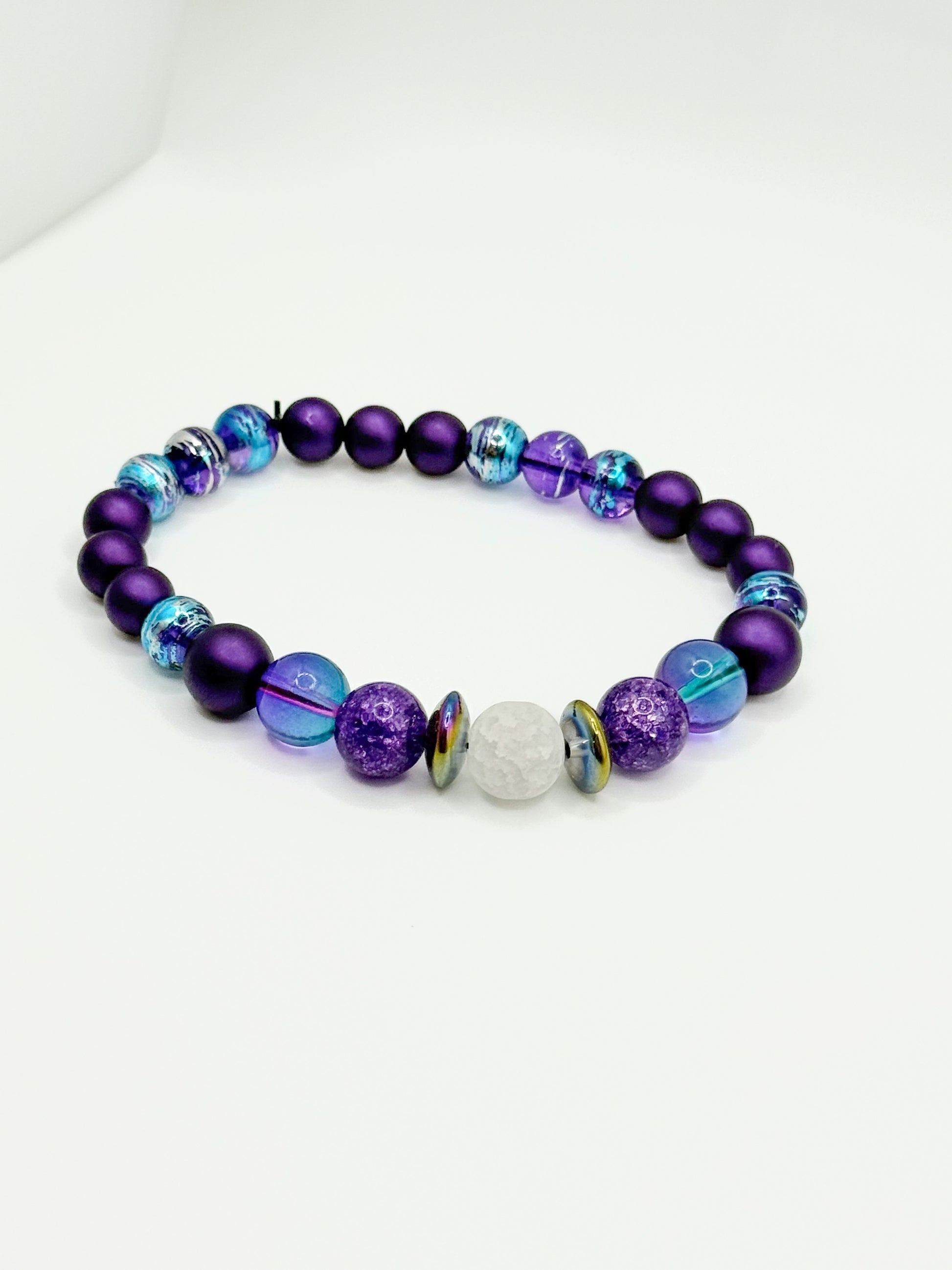 A stunning blend of deep Violet Quartz, icy White Quartz, and ocean Blue Quartz — accented with reflective Disc Spacers — Mystic Aurora offers luminous calm and cosmic flow — supporting emotional healing and intuitive clarity throughout your day.