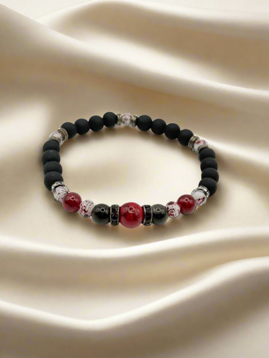 A bold blend of rich Red Quartz, Black Jasper, speckled detail beads, and gunmetal-toned accents — Crimson Shield offers grounded strength and dynamic clarity — supporting steady focus and empowered energy throughout your day.