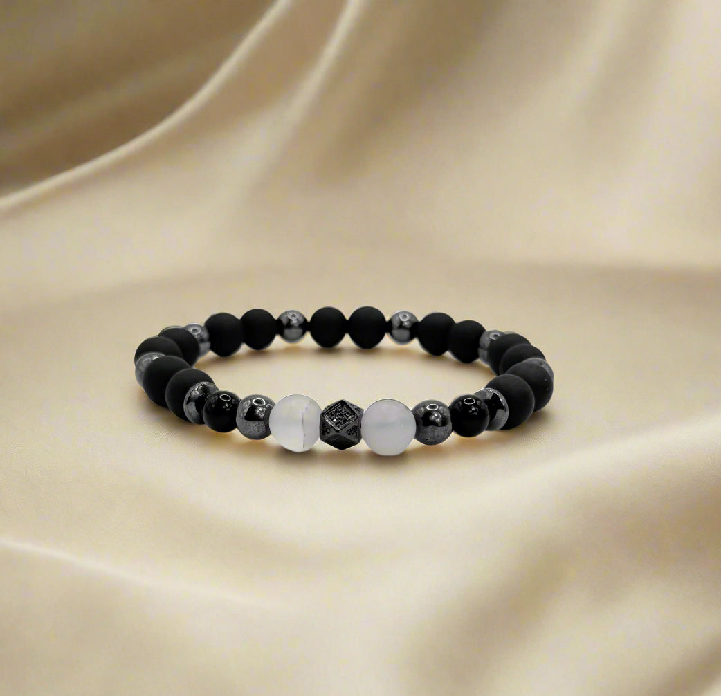 A bold assembly of Hematite, frosted Agate, milky Chalcedony, and matte black beads β Blackstone is made for the man who moves with precision, protects his peace, and speaks through presence, not volume.
